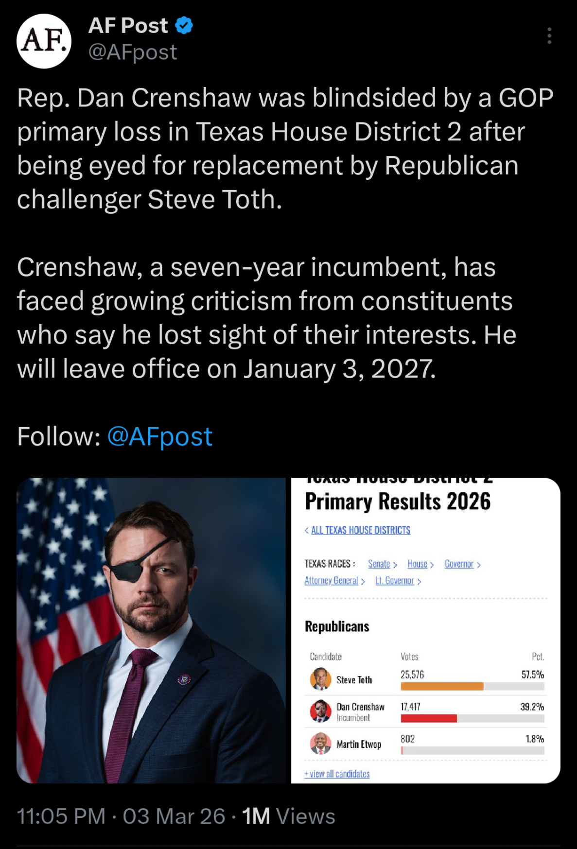 Dan Crenshaw just lost his House seat lmfao